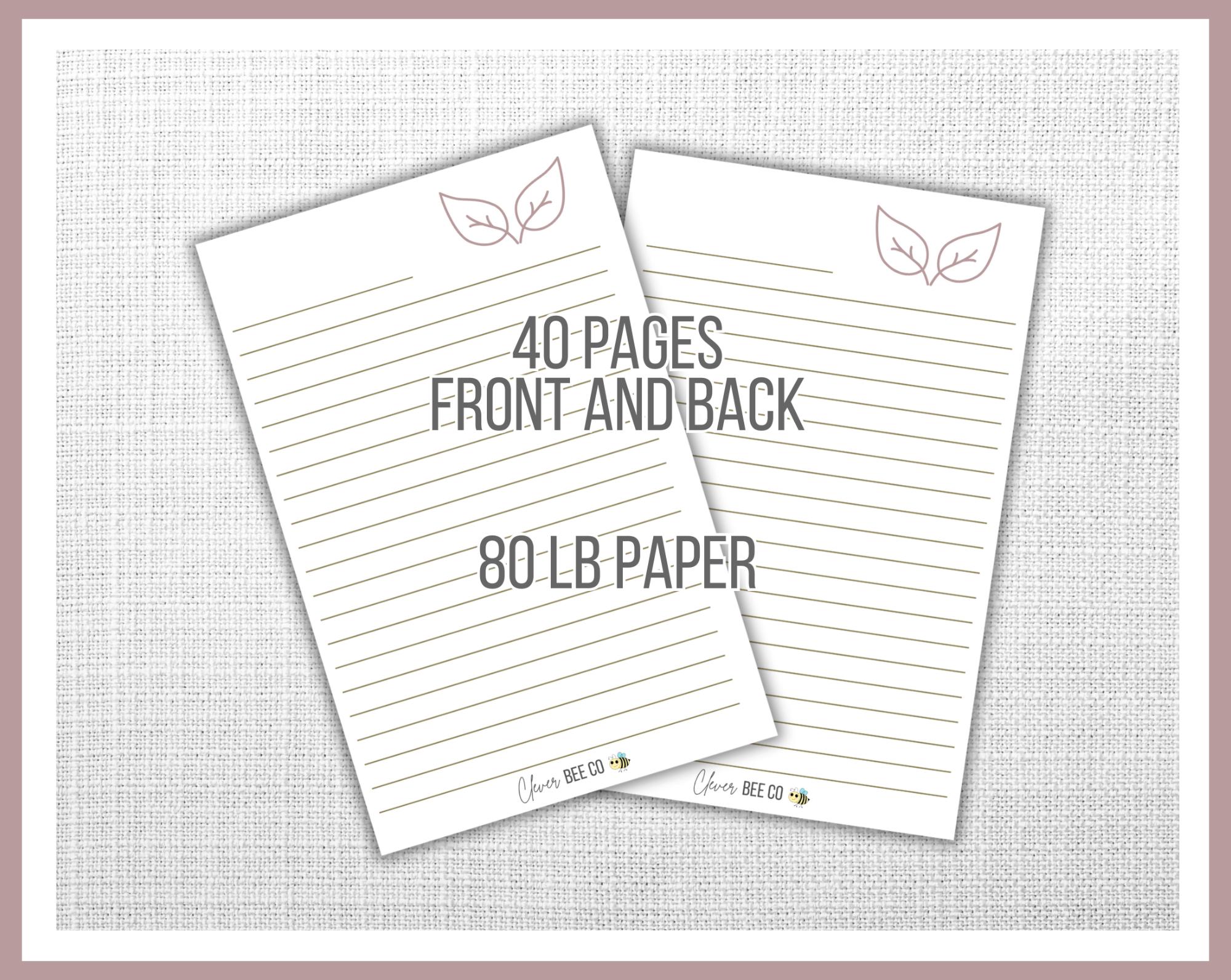 Heavy cardstock with Overlay Cover, 40 pages front and back 80lb lined paper with design , Coil binding