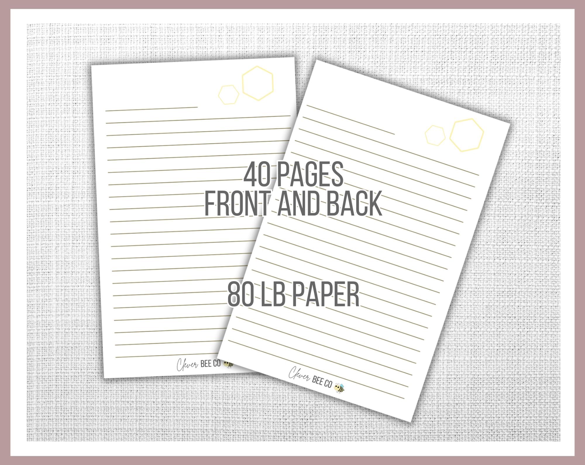Heavy cardstock with Overlay Cover, 40 pages front and back 80lb lined paper with design , Coil binding